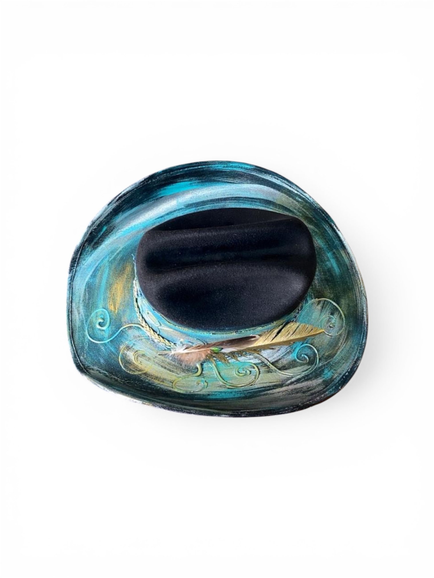 Sombrero Americano. Cuenta con acabado en tonos turquesa con efecto envejecido, detalles decorativos pintados a mano y banda trenzada con acentos de pluma. Diseño resistente para uso diario.