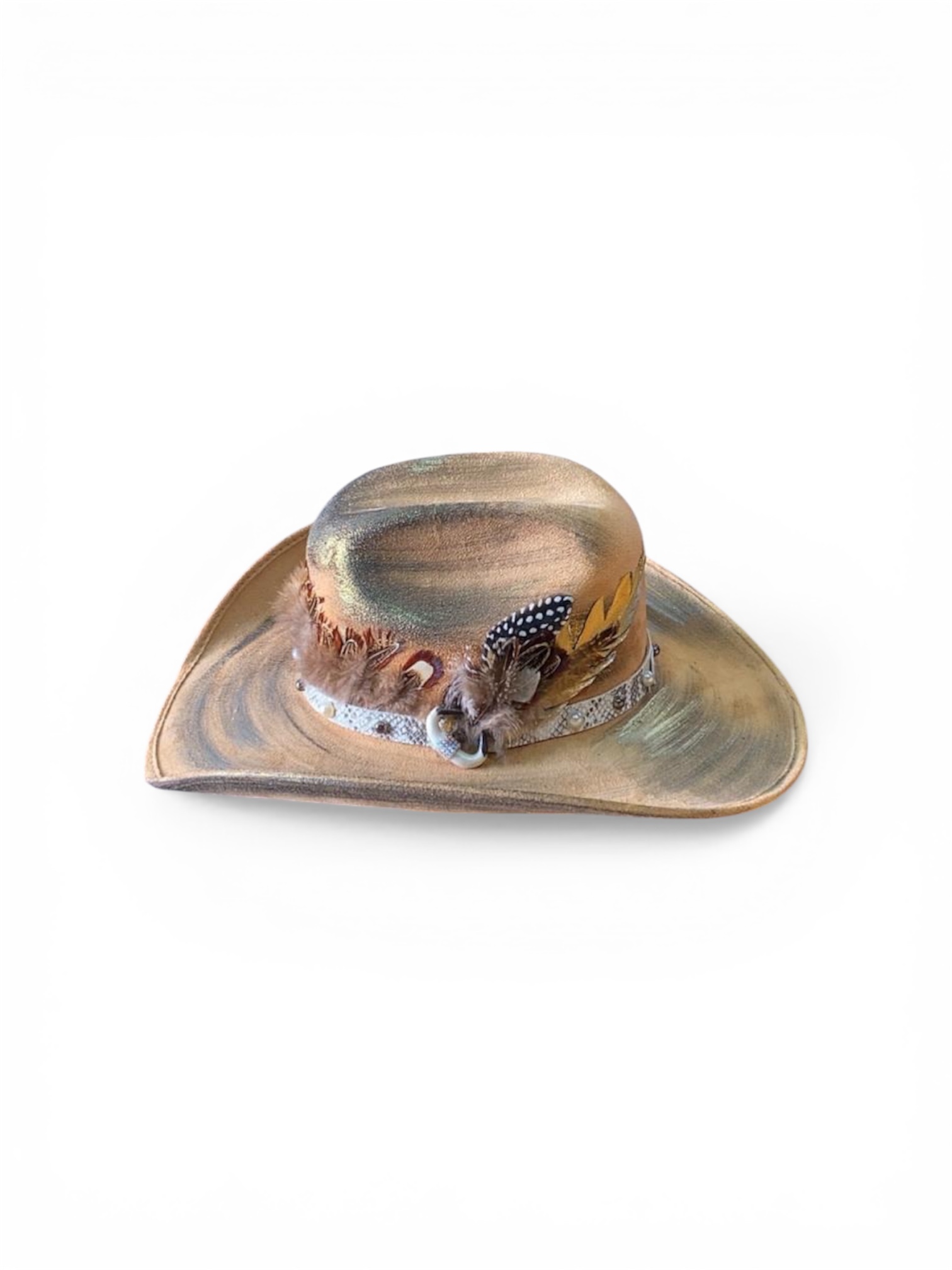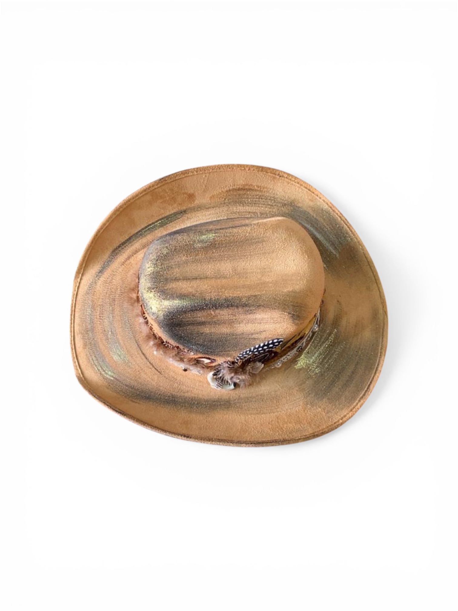 Sombrero Chihuahua. Cuenta con acabado en tonos moron con efecto envejecido, detalles decorativos pintados a mano y banda con acentos de pluma y piel. Diseño resistente para uso diario.